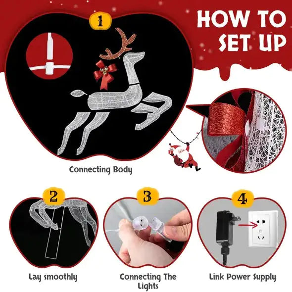 Specification Available Ship to: United States Details Introductions: This charming 3-Piece Lighted Set of 2 Reindeer & Sleigh is the perfect addition to your holiday décor. Featuring two reindeer pulling a santa's sleigh, this set is beautifully adorned with festive bowknots and sparkling glitter, capturing the magic of the holiday season. With its durable, weatherproof design and warm LED lights, it adds a cozy, enchanting glow to any indoor or outdoor space. Easy to assemble and store, this reindeer set will bring joy and festive cheer to your home year after year. Features: 1. Charming Reindeer & Sleigh Set: This delightful set features two reindeer pulling a santa's sleigh, each detailed with a festive bowknot and glistening glitter for added holiday sparkle. Loved by both kids and adults, this reindeer and sleigh set is sure to bring warmth and festive joy to your outdoor or indoor Christmas decorations. 2. Eye-Catching LED Lights: Pre-lit with 270 white LEDs, these reindeer glow beautifully in the night, creating an inviting holiday atmosphere. The well-placed LED lights make the reindeer a stunning focal point for your Christmas display, both day and night. 3. Weather-Resistant and Sturdy Build: Made from a durable, rustproof metal frame with waterproof fabric, the reindeer set is built to withstand wind, rain, and snow. The included ground stakes provide extra stability, ensuring your decorations stay secure in winter weather. 4. Easy Assembly & Storage: This collapsible reindeer set can be set up in minutes, allowing you to enjoy your festive display without hassle. The lights are pre-installed, simply connect the wires and plug them in to watch them come to life. 5.Perfect Holiday Decor for Indoor & Outdoor: Whether placed indoors near your Christmas tree, on the porch, or outdoors in the yard, this lighted reindeer set enhances any holiday setting. Perfect for holiday parties, weddings, or as a festive yard display, these reindeer bring elegance and a joyful touch to your celebrations. Specifications: 1. Overall Dimensions: (83 x 10.8 x 39.4) in / (211 x 27.5 x 100) cm 2. Number of Lights: 270pcs 3. Light Color: White Package Includes: 1 x 2 Reindeer & Sleigh Set 1 x Set of Ground Stakes
