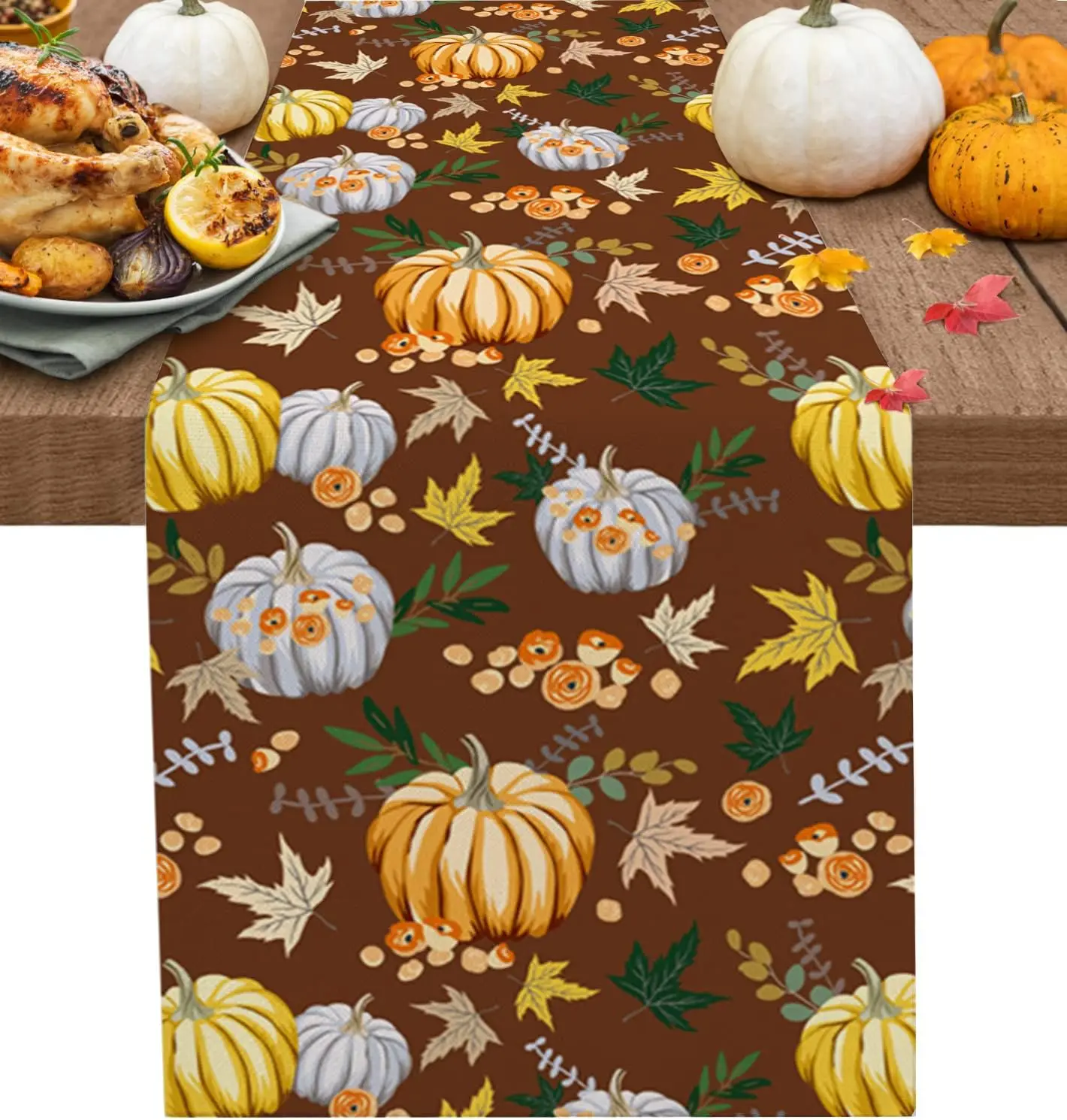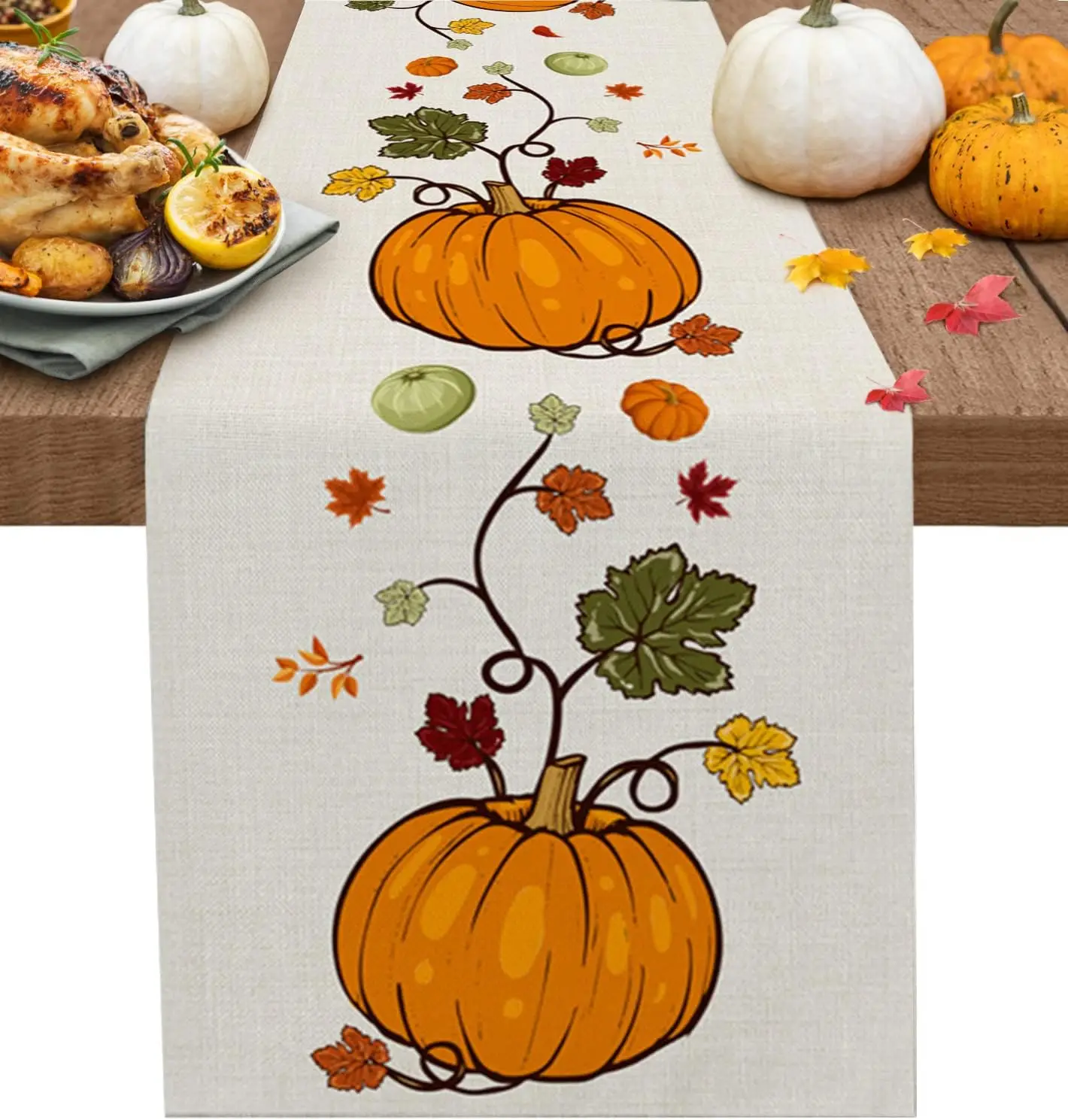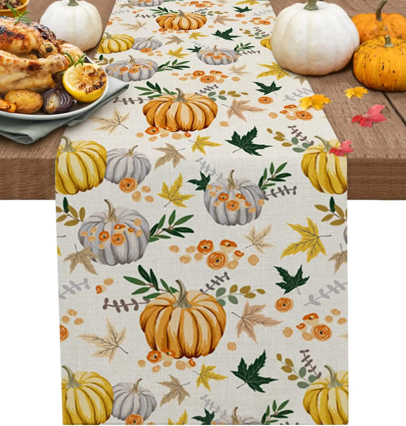Autumn Pumpkins Maple Leaves Linen Table Runner for Table Decoration Fall Thanksgiving Harvest Table Runners Wedding Party Decor